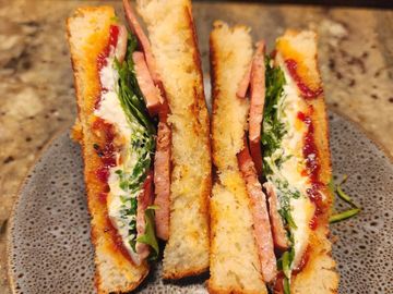 Chorizo, Swiss cheese, house made chilli jam, goats cheese and rocket on our house made toasted bread