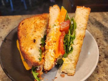 Roasted Pumpkin, capsicum, goats cheese mix and rocket on our house made toasted bread.