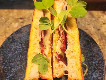 Bacon, Swiss cheese and wholegrain mustard dipped in egg and fried on our house made bread . (GF Available)