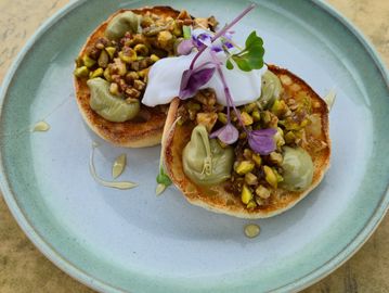 House made English muffins, pistachio spread, walnut and pistachio crunch and coconut yoghurt
