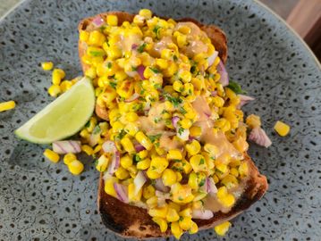 Roasted corn, onion, parsley spice mix and lime with a chilli, garlic Mayo served on our house made bread.